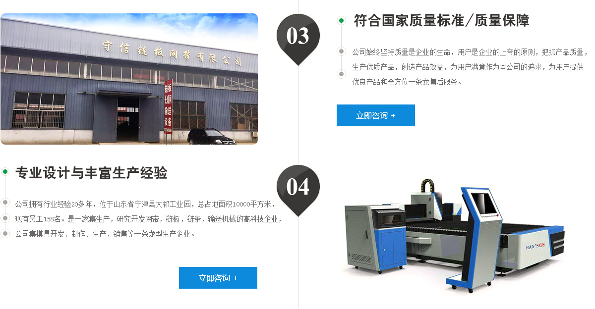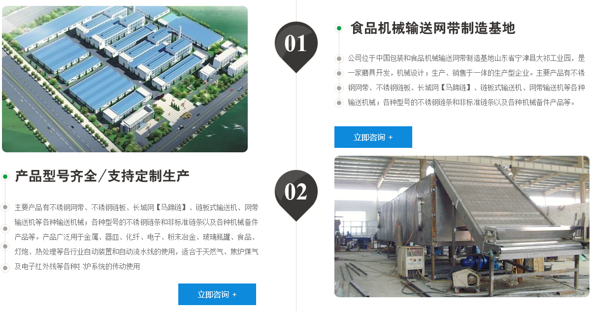 寧津縣守信鏈板網帶有限公司是中國包裝和食品機械輸送網帶制造基地,位于山東省寧津縣大祁工業園,是一家磨具開發(fā),機械設計;生產、銷售于一體的生產型企業。主要產品有不銹鋼網帶、不銹鋼鏈板、長城網【馬蹄鏈】、鏈板式輸送機、網帶輸送機等各種輸送機 械;各種型號的不銹鋼鏈條和非標準鏈條以及各種機械備件產品等。產品廣泛用于金屬、器皿、化纖、電子、粉末冶金、玻璃瓶罐、食品、燈炮、熱處理等各行業自動裝置和自動流水線的使用,適合于天然氣、焦爐煤氣及電子紅外線等各種窯爐系統的傳動使用,本廠始 終堅持質量是企業的生命,用戶是企業的上帝的原則,把抓產品質量,生產優(yōu)質產品,創造產品效益,為用戶滿意作為本公司的追求,為用戶提供優(yōu)良產品和全方位一條龍售后服務。...... 更多>>